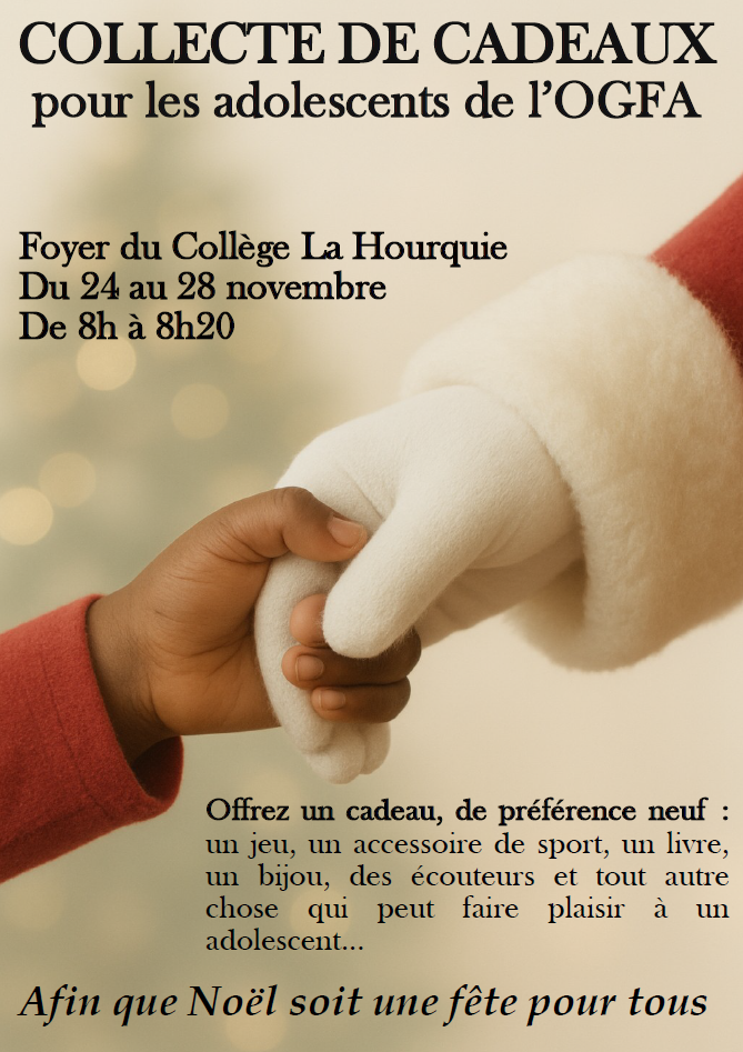 La International School of Béarn et le collège de Morlaàs ont organisé de magnifiques collectes de jouets et de jeux neufs, pour les enfants et les adolescents hébergés à l’OGFA. Ces cadeaux apporteront de la joie aux enfants durant les fêtes. L’International School of Béarn a même organisé une boom, dont l’intégralité des fonds récoltés nous sera reversée pour créer des moments conviviaux dans nos services.