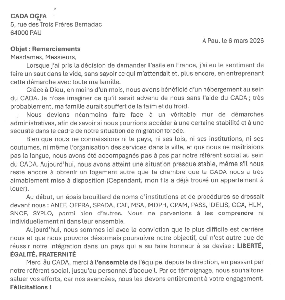 – Une famille entière — arrivée en France sans connaître le pays, ses lois et sa langue — nous adresse une lettre après avoir été accueillie au CADA. « J’ai eu le sentiment de faire un saut dans le vide, sans savoir ce qui m’attendait. Un épais brouillard de noms d’institutions et de procédures se dressait devant nous. Nous ne parvenions à les comprendre ni individuellement ni dans leur ensemble ». Puis, pas à pas, accompagnés par leur référent social, ils ont avancé. Et aujourd’hui, ils écrivent : « Nous sommes ici avec la conviction que le plus difficile est derrière nous et que nous pouvons désormais poursuivre notre objectif, qui n’est autre que de réussir notre intégration dans un pays qui a su faire honneur à sa devise. Nos avancées, nous les devons entièrement à votre engagement. »
