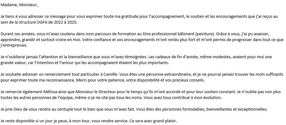 – Un jeune homme, arrivé seul, en France, alors qu’il était encore mineur. Accompagné pendant trois ans par nos équipes, il a décroché un titre professionnel en peinture bâtiment. Aujourd’hui, il travaille. Il nous dit : « Grâce à vous, j’ai pu avancer, apprendre, grandir et surtout croire en moi. Votre confiance et vos encouragements m’ont rendu plus fort. Je n’oublierai jamais l’attention et la bienveillance que vous m’avez témoignées. Les cadeaux de fin d’année, même modestes, avaient pour moi une grande valeur, car l’intention et l’amour qui les accompagnaient étaient les plus importants. Je reste disponible si un jour je peux, à mon tour, vous rendre service. »